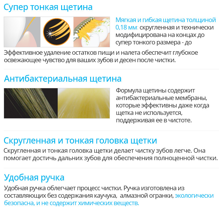 Сверхтонкая щетина с толщиной щетинок всего 0,18 мм эффективно удаляет остатки пищи и налёта с зубов, благодаря чему обеспечивает освежающее чувство для ваших зубов и дёсен.