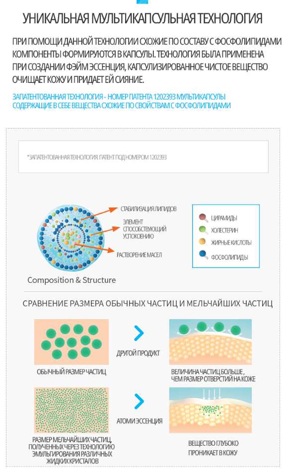 Вторая уникальная технология, это мультикапсульная технология. При помощи данной технологии компоненты схожие по составу с фосфолипидами формируются в капсулы для более эффективного очищения кожи и придания ей эффекта сияния.